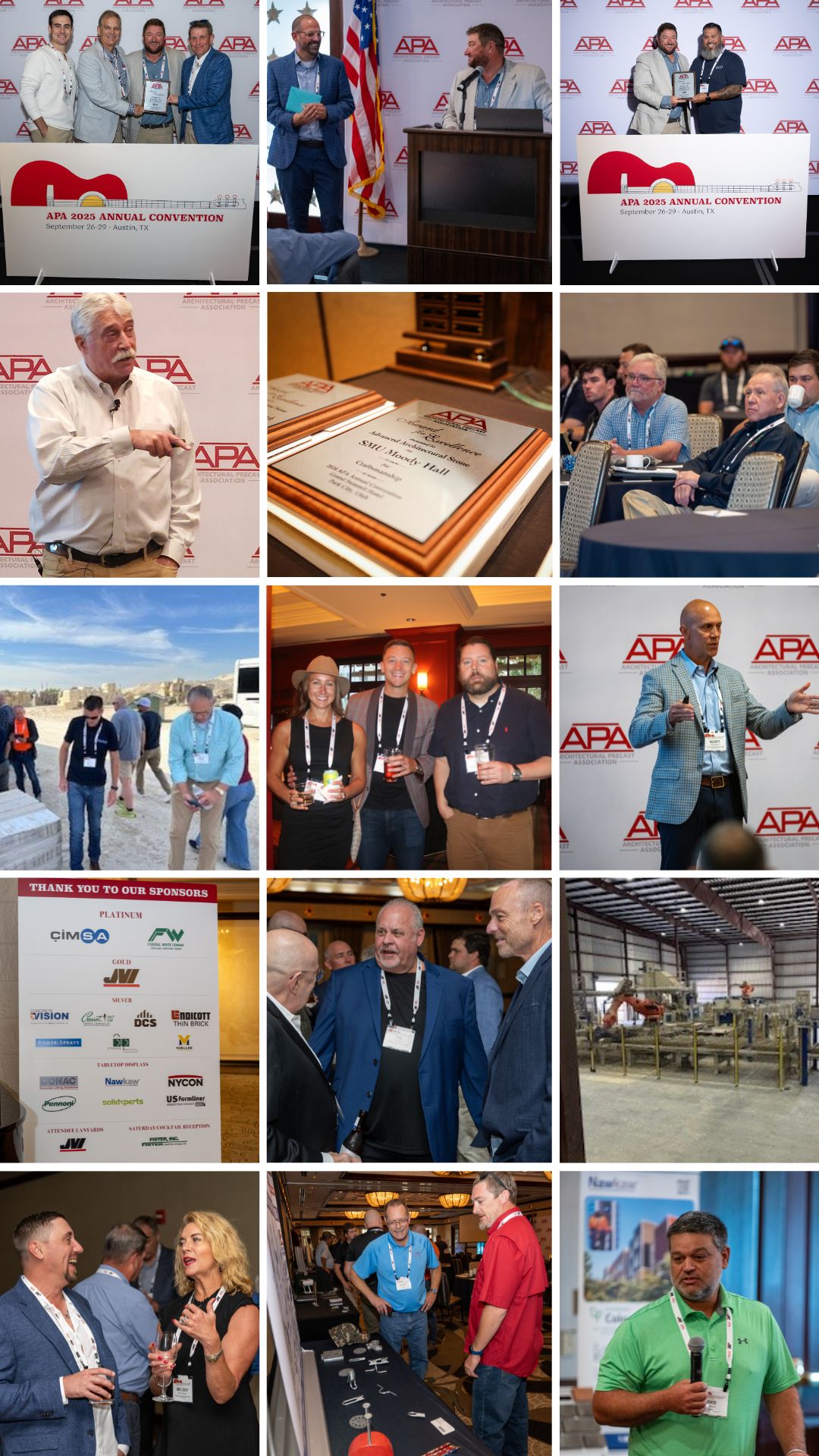 2025 ANNUAL CONVENTIONThe 2025 APA Annual Convention in Austin, Texas was an incredible event packed with inspiration, learning, and fun. The weekend kicked off with Brad Humphries sharing leadership lessons and field-tested strategies for achieving competitive success, followed by Scott Millson’s session on the BE5 Framework. Attendees engaged in interactive panels throughout the event, tackling real-world challenges in cements, mix designs, and admixtures. Networking was a big highlight, with plenty of chances to connect—from the JBT Championship Golf Tournament that raised money for The Cure Starts Now Foundation to the closing awards dinner honoring top achievements in architectural precast. The event wrapped up with plant tours at Espinoza Stone and Austin Block & Hardscape, giving everyone a behind-the-scenes look at outstanding plants. The convention was a perfect mix of education, collaboration, and good times. Attendees left feeling inspired, informed and connected. If you missed it, you missed a truly special event! Some photos from the event: ![]()